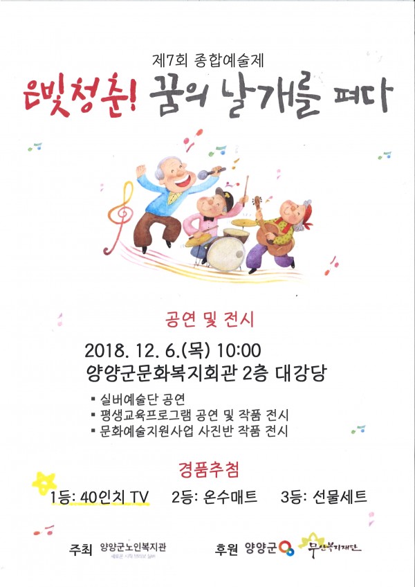 제7회 종합예술제 "은빛청춘! 꿈의 날개를 펴다" 페이지 정보 작성자 작성일18-12-04 11:03 조회535회 관련링크 이전글 다음글 목록 본문 많은 관심과 참여 부탁드립니다. 이전글 다음글 목록