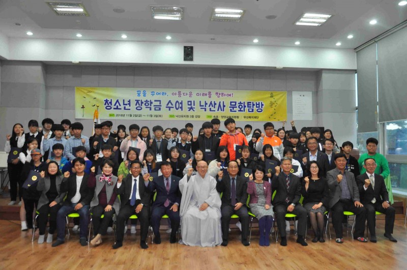 사회복지법인 대한불교조계종 무산복지재단(이사장: 금곡 정념스님)은 2018년 11월 2일(금요일) 오후 4시 낙산유치원 강당에서 양양관내 초등학생 20명, 중학생 25명, 고등학생 25명으로 총 70명에게 장학금수여 및 낙산사문화탐방 프로그램 진행에 4천만원을 지원하였습니다.
